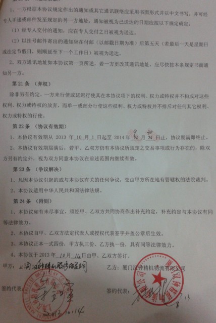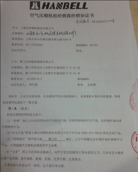 2013年10月份臺(tái)灣漢鐘精機(jī)授權(quán)廈門(mén)漢鐘精機(jī)有限公司--總代理經(jīng)銷(xiāo)權(quán)